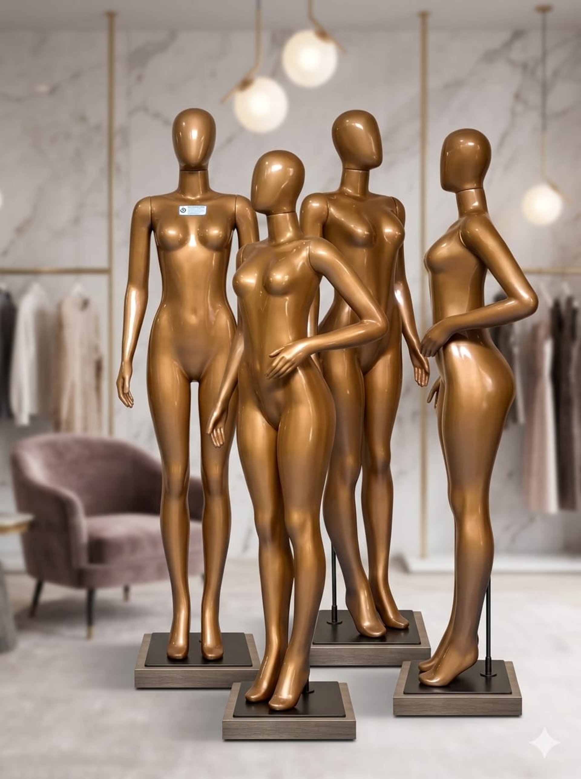 Acabamentos Especiais: Manequins com acabamentos metalizados, cores foscas ou texturas específicas (como as tonalidades júpter, savana, golden, bronze e rose) podem apresentar variações sutis de tonalidade inerentes ao processo de pintura e cura.